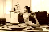 Asian sportswoman practicing eka pada rajakapotasana asana on a yoga mat in a serene living room, embodying balance and flexibility