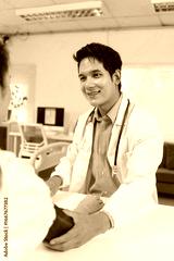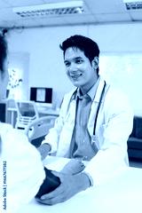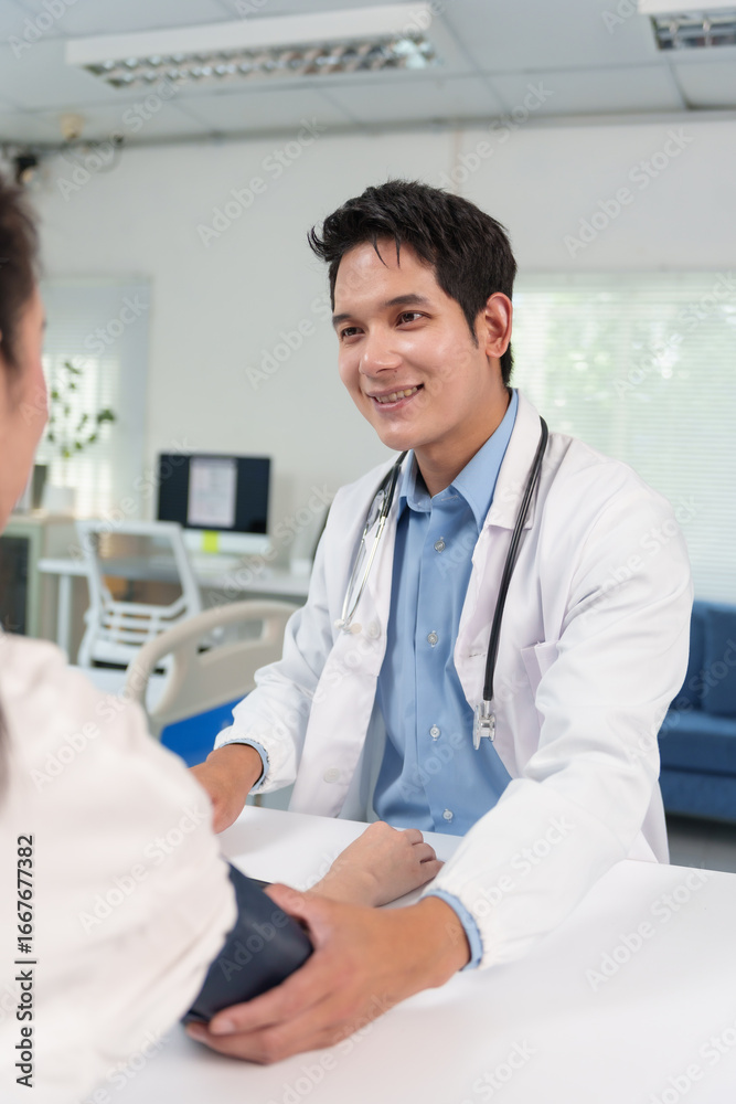 Smiling doctor checking a patient's blood pressure during a thorough medical examination in a hospital room, ensuring optimal health