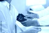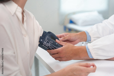 Doctor checking a patient's blood pressure with a digital pressure gauge in a clinic, ensuring accurate health monitoring and assessment