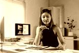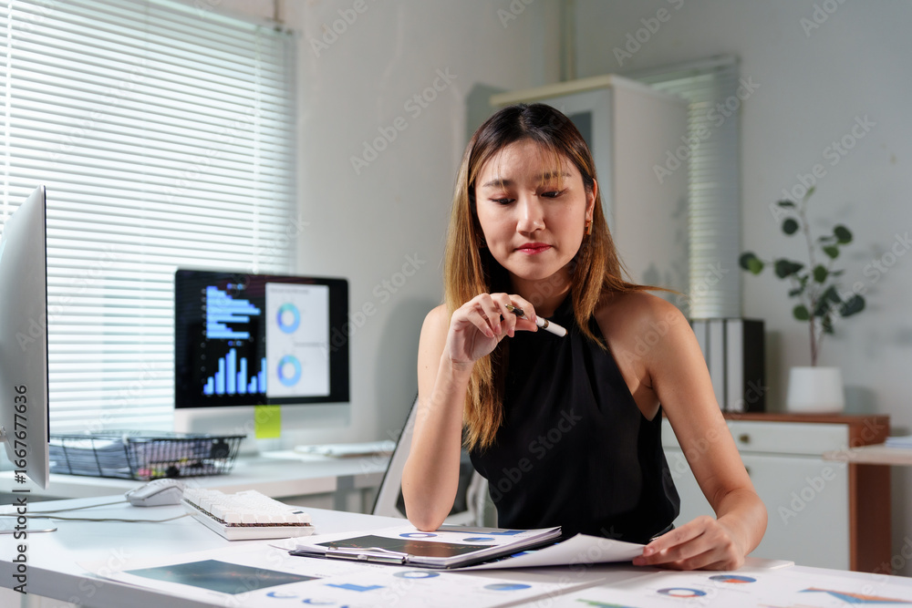 Asian businesswoman analyzing financial reports while working on a computer in a modern office filled with natural light and sleek design