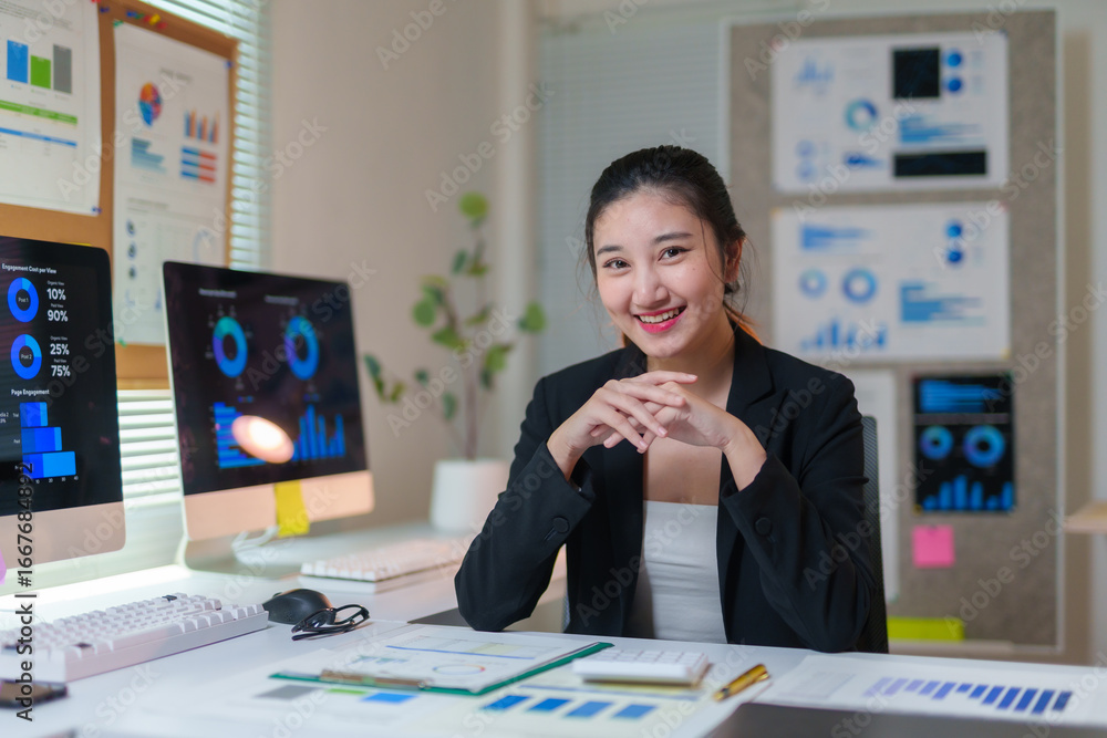 Young Asian businesswoman smiling and working with financial charts, graphs and computer at office desk