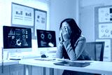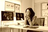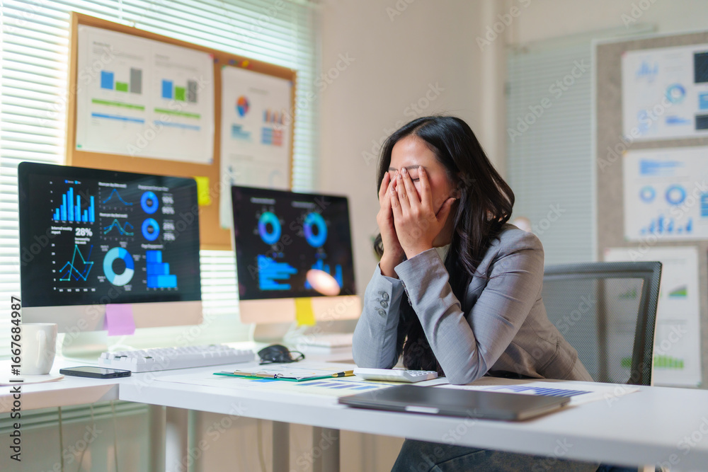 Asian businesswoman covering her face with her hands, suffering from headache or burnout, sitting at desk with financial charts on computer screen