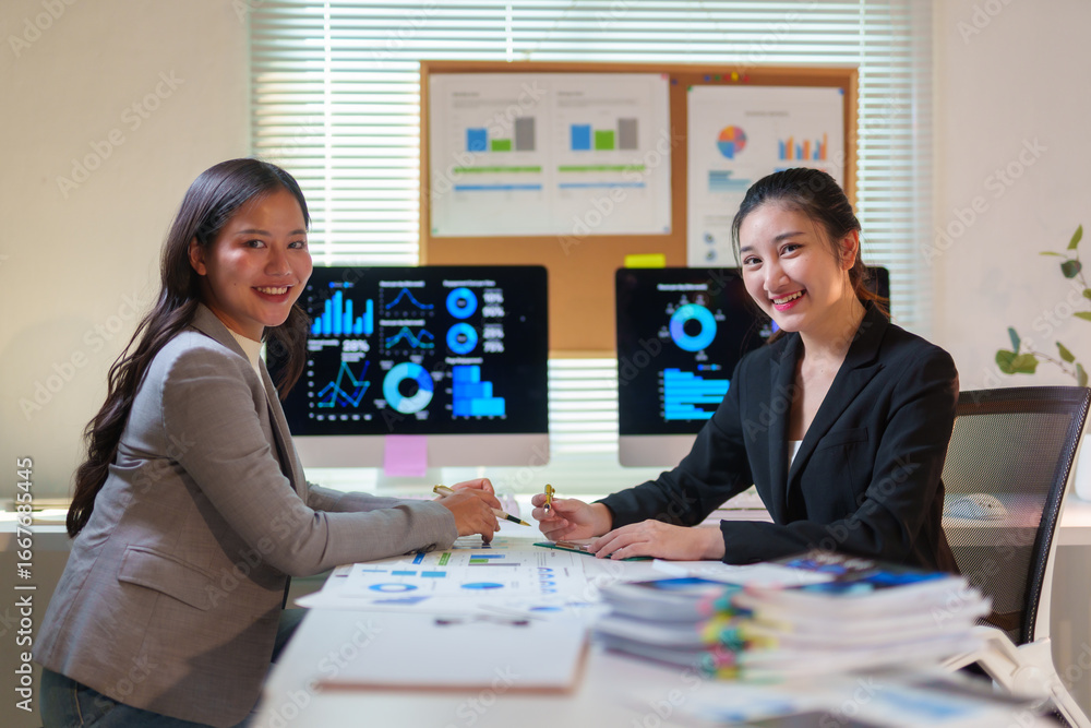 Two smiling businesswomen working together analyzing financial data using computer and printed reports in a modern office