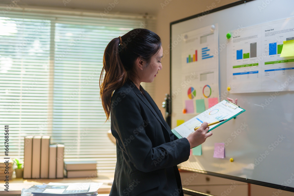 Businesswoman holding clipboard and pen analyzing financial charts and graphs displayed on whiteboard during a business meeting