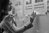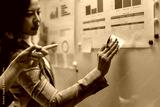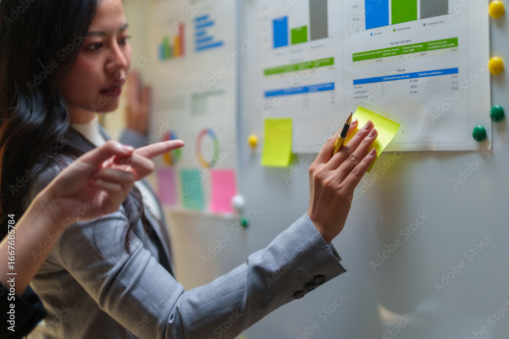 Businesswomen using sticky notes while analyzing financial charts and reports during a productive meeting