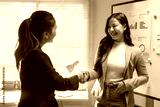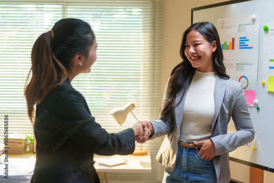 Two asian businesswomen shaking hands after successful meeting in office near whiteboard with graphs