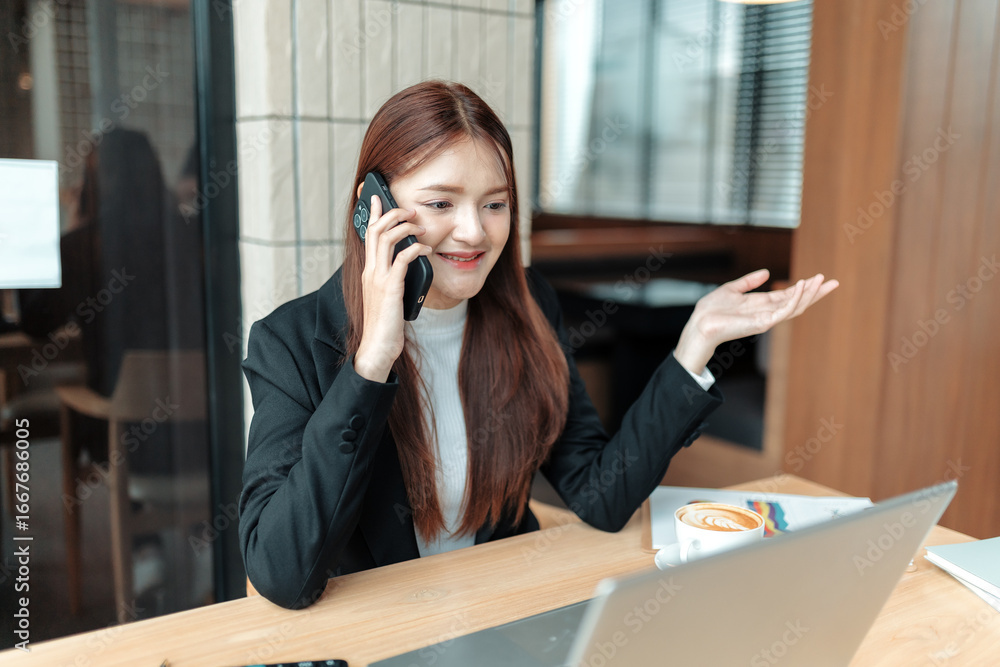Young Asian businesswoman engaging in a phone conversation and gesturing expressively while working on her laptop in a cozy cafe