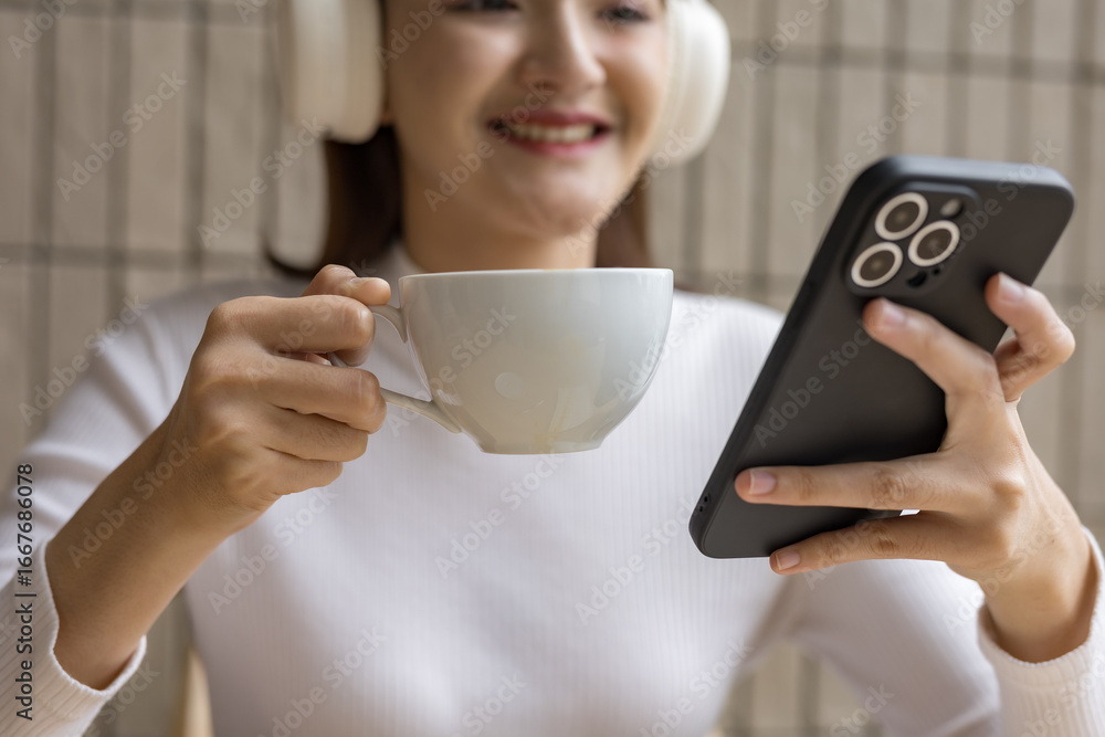 Young woman enjoying a hot drink while wearing headphones, smiling and browsing on her smartphone in a cozy indoor setting