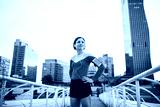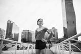 Young woman with smartphone standing outdoors in city, resting after exercise.