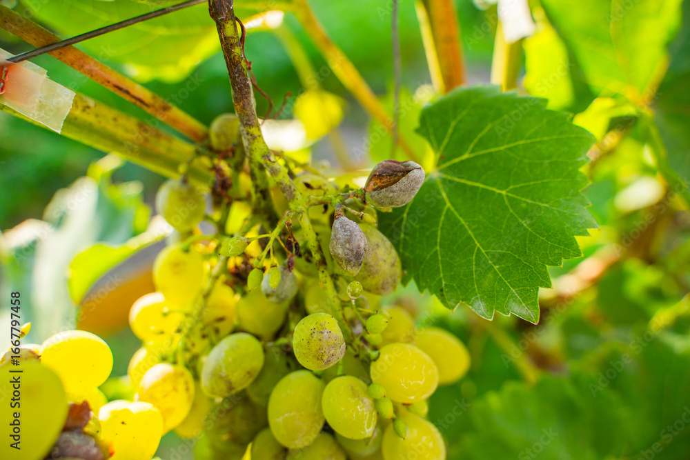 Spoiled grapes from fungal disease, close-up. Lost grape harvest