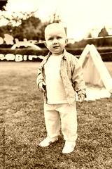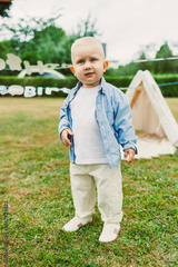 An adorable young child dressed in a stylish outfit is joyfully enjoying an outdoor birthday celebration filled with friends and family, creating lasting memories in a beautiful sunny landscape