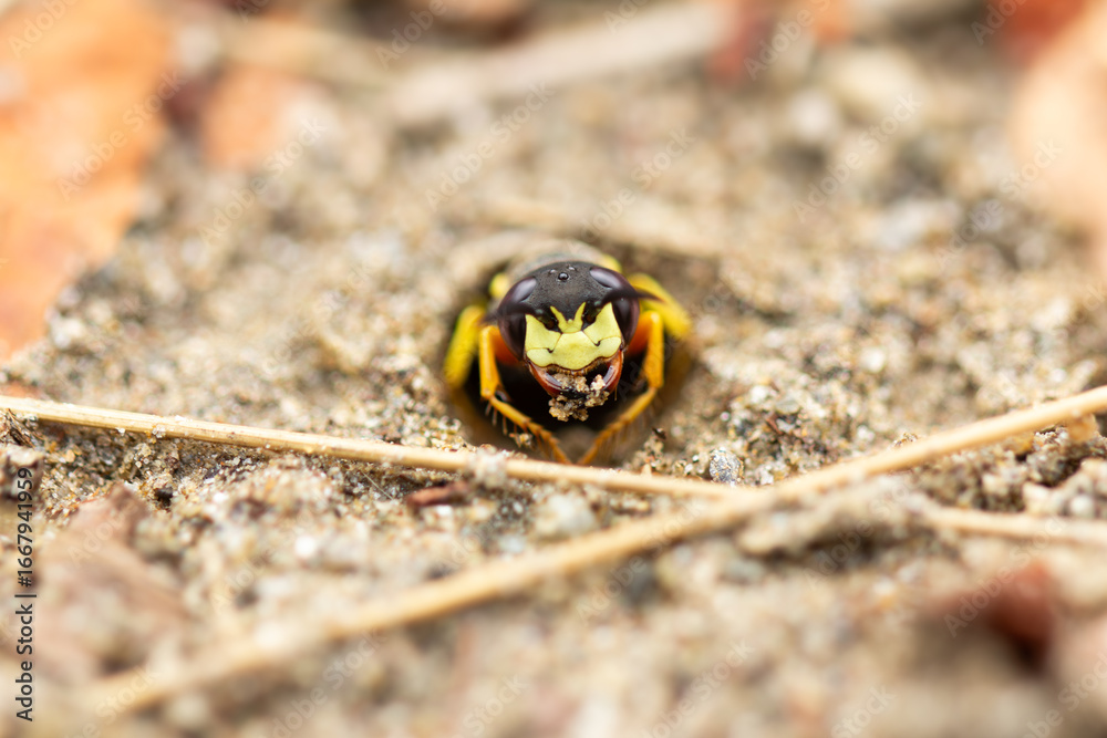 Ground Wasp Emerging from Nest in Sand, Macro Close-up