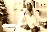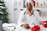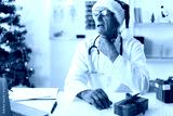 Senior elderly Doctor in Santa hat on the shift on christmas eve suffering sore throat from a cold. healthcare concept