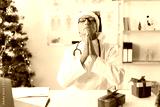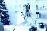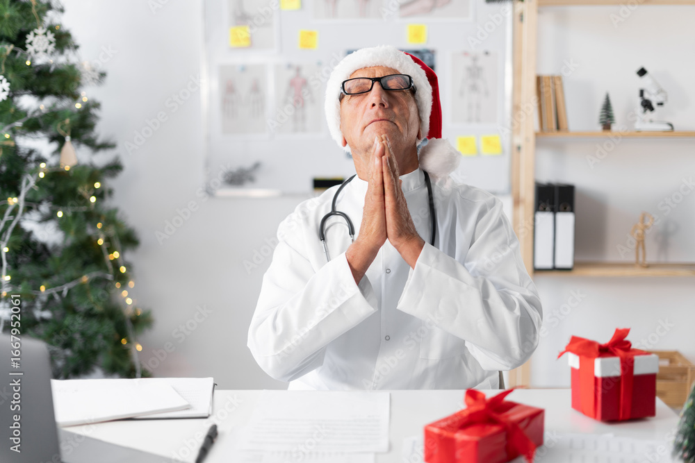 Senior elderly Doctor in Santa hat on the shift on christmas eve praying to GOD with hope and faith