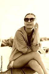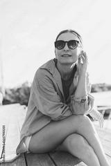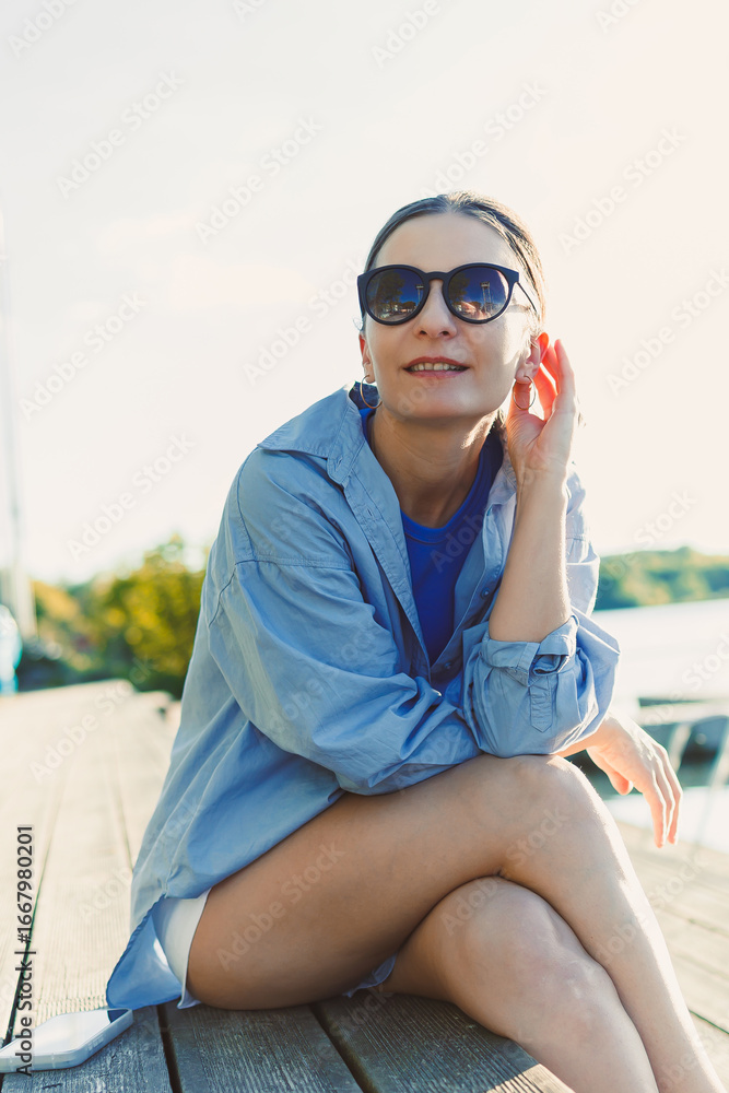 On a sunny day, a young woman sits by the serene water, immersed in the calm atmosphere, feeling content while enjoying the warm sunshine and refreshing summer landscape around her