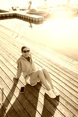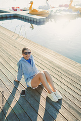 Relaxing by the tranquil waterside, a young woman fully embraces a sunny day as she enjoys herself on the picturesque dock, taking in the vibrant surroundings and feeling the blissful atmosphere