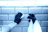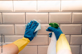 Using cleaning products for cleaning table in kitchen at home. Housekeeping, household chores.