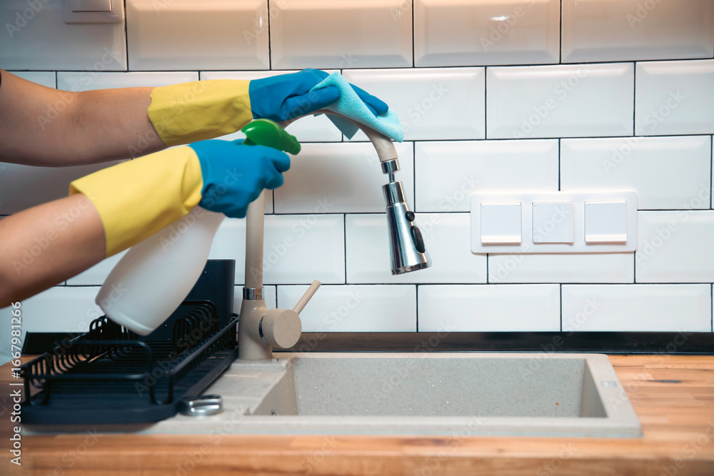 Using cleaning products for cleaning table in kitchen at home. Housekeeping, household chores.