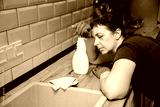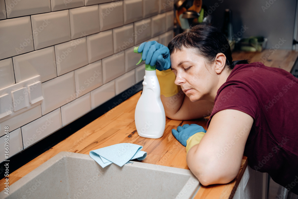 Tired woman with gloves cleaning the kitchen. Surface sanitizing.