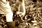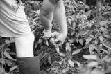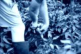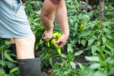 Close up farmer hand harvesting fresh organic green bell pepper in farm, agricultural concept