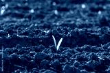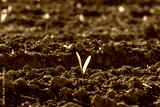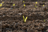 Green shoots of corn emerging from fertile soil in a sunlit field during early spring growth phase