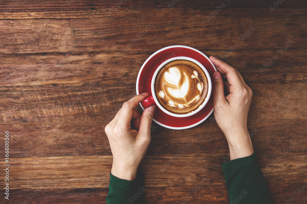 Cup of Coffee Latte Holding by Woman hand Lay on Wooden Table in Cafe, Top view