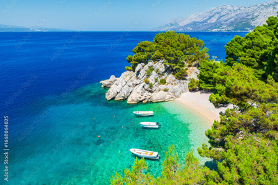 Makarska, Croatia. Crystal-clear turquoise waters and white pebble beaches in small bay of Punta Rata, Brela.