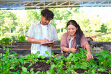 Male and female students checking vegetable growth and taking notes, symbolizing education and learning.