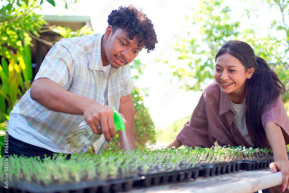 Male and female students checking vegetable growth and taking notes, symbolizing education and learning.