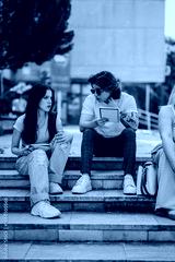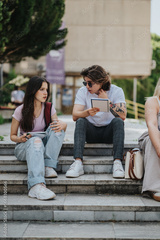 Two students sitting on steps, having an interactive conversation. A casual educational setting captured outdoors.