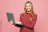 Young smiling happy IT woman she wearing red striped sweatshirt casual clothes holding use work on laptop pc computer isolated on plain pastel light pink background studio portrait. Lifestyle concept.