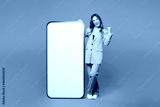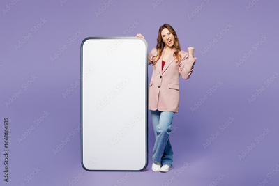 Full body young woman in beige jacket formal clothes big huge blank screen mobile cell phone smartphone with area do winner gesture isolated on plain pastel light purple background Lifestyle concept