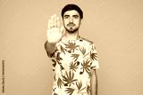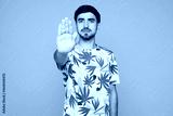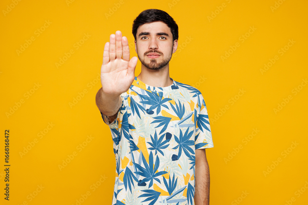 Young sad strict serious Caucasian man wear blue beach t-shirt casual clothes showing stop gesture with palm look camera isolated on plain yellow orange background studio portrait. Lifestyle concept.
