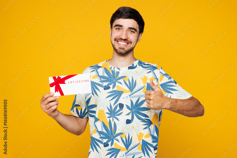 Young fun man he wear blue beach t-shirt casual clothes hold gift certificate coupon voucher card for store show thumb up isolated on plain yellow orange background studio portrait. Lifestyle concept.