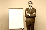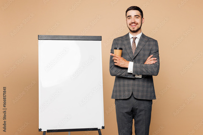 Young successful employee business man corporate lawyer wear classic formal grey suit shirt work in office stand near blank whiteboard drink coffee isolated on plain beige background studio portrait.