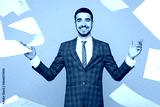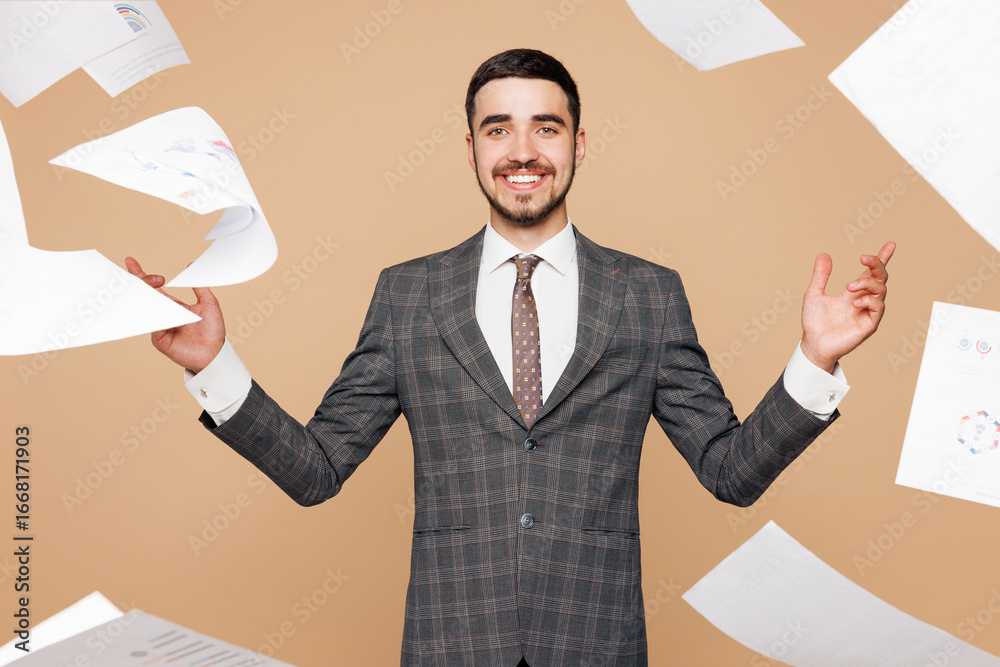 Young happy successful employee business man corporate lawyer in classic formal grey suit shirt tie work in office throw up paper account documents isolated on plain beige background studio portrait