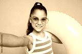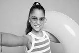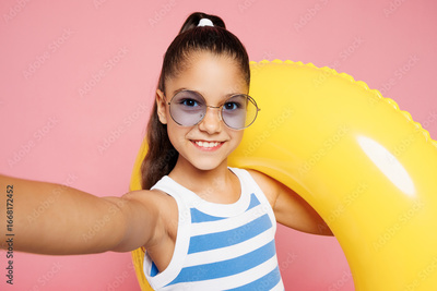 Traveler fun kid child wear casual clothes rest near hotel pool hold inflatable rubber yellow ring do mobile phone selfie gesture isolated on plain pink background Summer vacation sea sun tan concept.