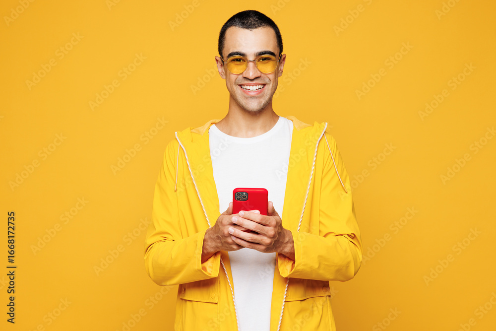 Young smiling happy fun middle eastern man he wear raincoat casual clothes sunglasses hold in hand use mobile cell phone isolated on plain yellow orange background studio portrait. Lifestyle concept.