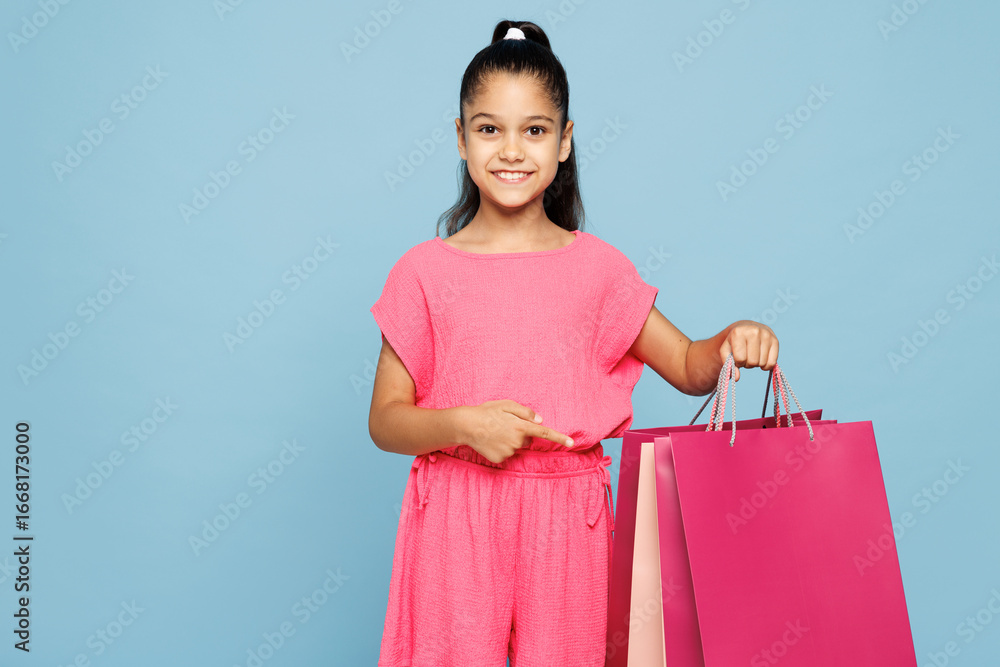 Little smiling happy kid girl 9-10 years old wear pink clothes hold in hand point on paper package bags after shopping look camera isolated on plain blue background. Black Friday sale buy day concept.