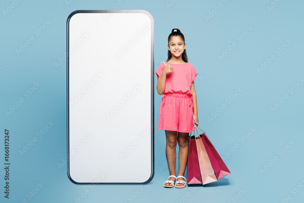 Little kid girl 9-10 years old wear pink clothes hold package bags after shopping big huge blank screen mobile cell phone show like isolated on plain blue background Black Friday sale buy day concept