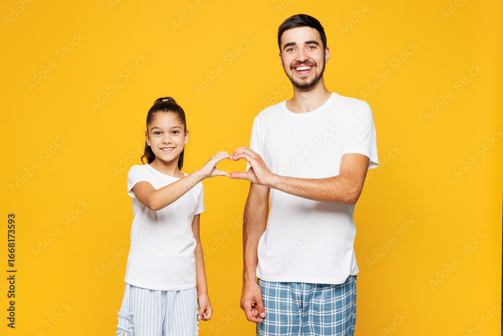 Young parent man have fun with child girl in blue pyjamas clothes. Daddy little kid show shape heart with hands heart-shape sign isolated on plain yellow background. Father's Day Love family concept.