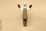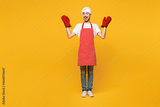Full body young fun housewife housekeeper chef cook baker man he wear red apron toque hat two oven mitts look camera isolated on plain yellow orange background studio portrait. Cooking food concept.