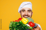Close up young housewife housekeeper chef cook baker man wear red apron toque hat hold in hand bowl with raw vegetables isolated on plain yellow orange background studio portrait Cooking food concept