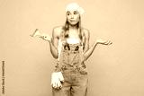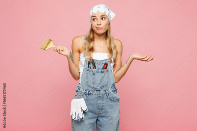 Young sad confused employee laborer handyman woman wear denim overhaul hold in hand use paint brush isolated on plain pink background. Instruments for renovation apartment room. Repair home concept.