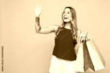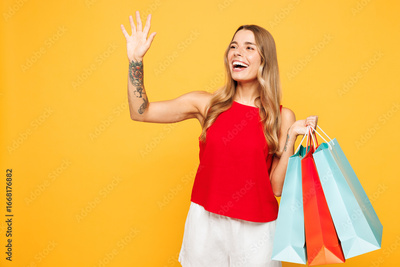 Young smiling happy woman wear red casual clothes hold in hand paper package bags after shopping waving hand meet somebody isolated on plain orange yellow background Black Friday sale buy day concept