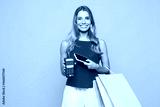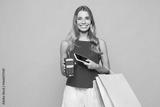 Young woman wears red casual clothes hold shopping package bags bank payment terminal process acquire mobile cell phone isolated on plain orange yellow background. Black Friday sale buy day concept.