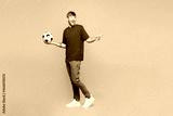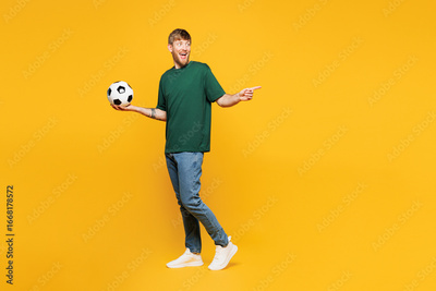 Full body young happy man fan wear basic green t-shirt cheer up support football sport team hold in hand soccer ball watch tv live stream point finger aside isolated on plain yellow orange background.