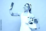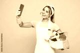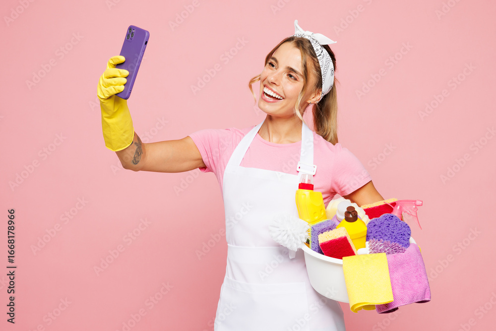 Young woman wear white apron hold basin with detergent bottles while doing housework tidy up do selfie shot on mobile cell phone isolated on plain pastel light pink background. Housekeeping concept.