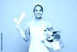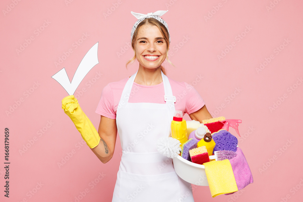 Young smiling woman wear white apron hold basin with detergent bottles while doing housework tidy up, check mark to do list sign isolated on plain pastel light pink background. Housekeeping concept.