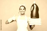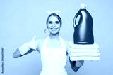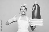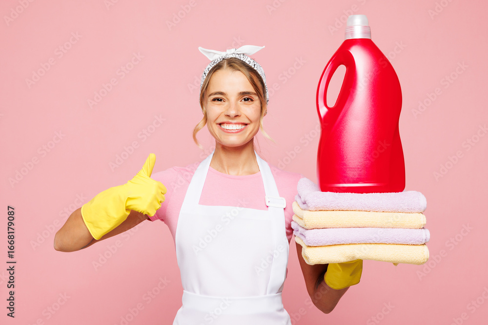 Young smiling woman wear white apron hold stack of fresh towels with red detergent bottle while do housework tidy up show thumb up isolated on plain pastel light pink background. Housekeeping concept.